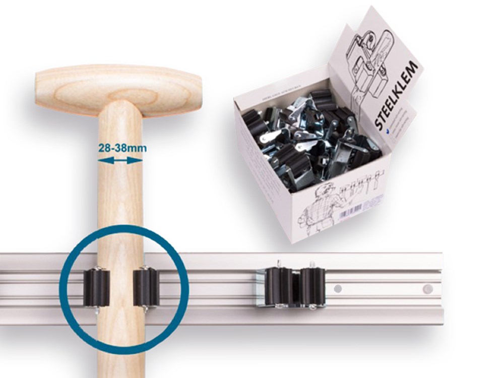 1 x Displaydoos PRAX met steelklemmen rond 35 mm. Inhoud / Prijs per 20 stuks. De Prax steelklem houdt elke steel of deze nu rond of vierkant is, in de klem. Optioneel is de Prax Vario Rail 48 cm voor de Prax steelklemmen art.nr. 1107430.