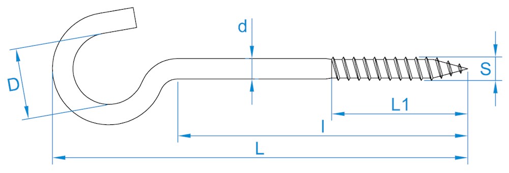 Deze schroefhaak met houtdraad en kleine haak wordt ook wel lamphaak genoemd. De schroefhaak is verkrijgbaar in diverse diktes en lengtes. Schroefhaken hebben een normale schroefdraad voor hout.