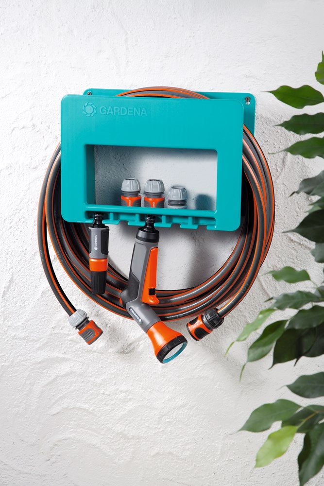 Praktische ophangmogelijkheid voor de tuinslang en de Original GARDENA System aansluitstukken, met tussenlaag