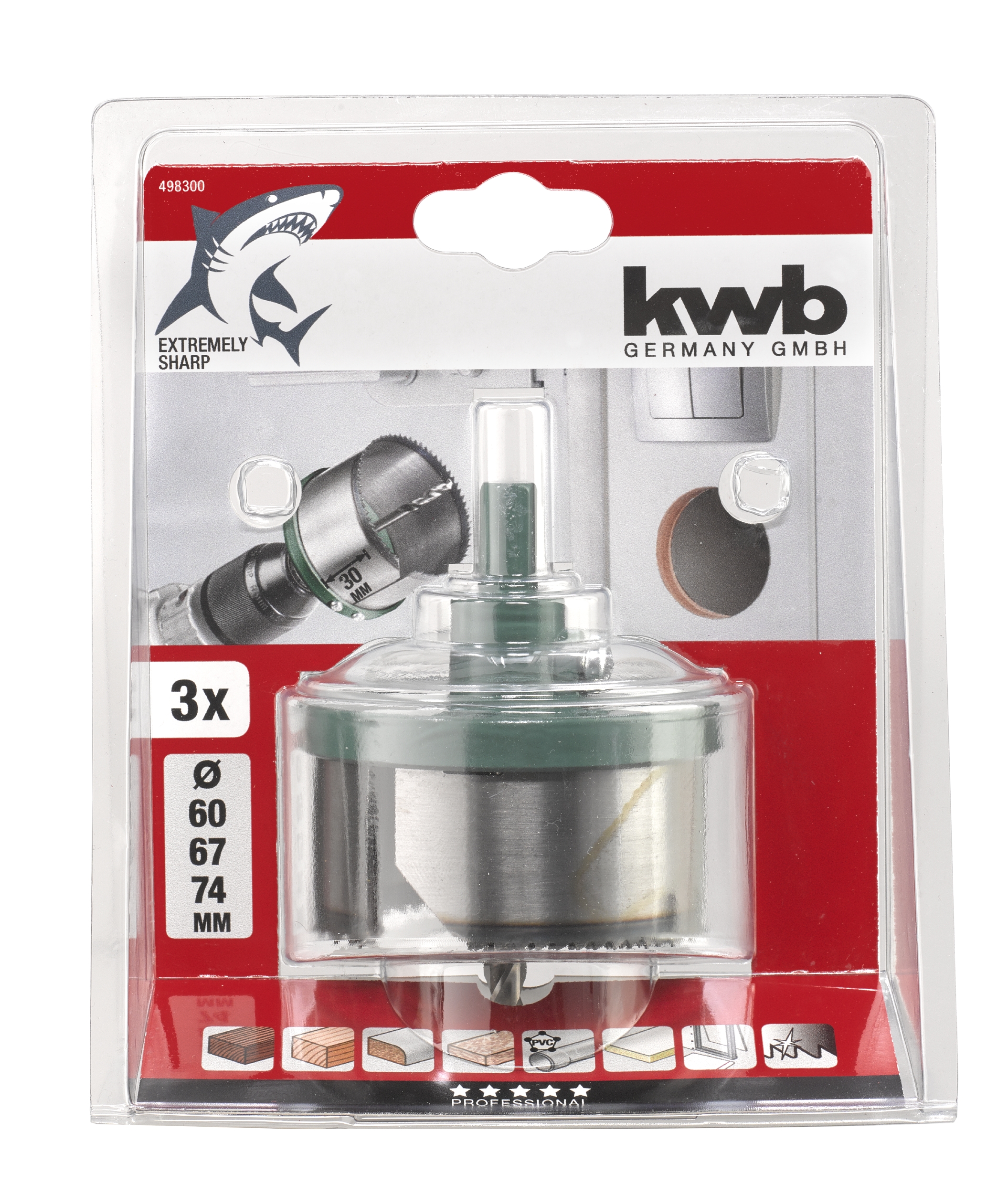 kwb Meergatenzagen, 3-delig -- Gatenzaag, 3-delig, zware zinken gespuitgiete steunschijf, zaagkrans van gehard veerstaal, tandpunten inductief gehard, voor gebruik in hout, hout met kunststof coating, hardhout, spaanplaten, gipsplaten, lichte bouwplaten en kunststof.
