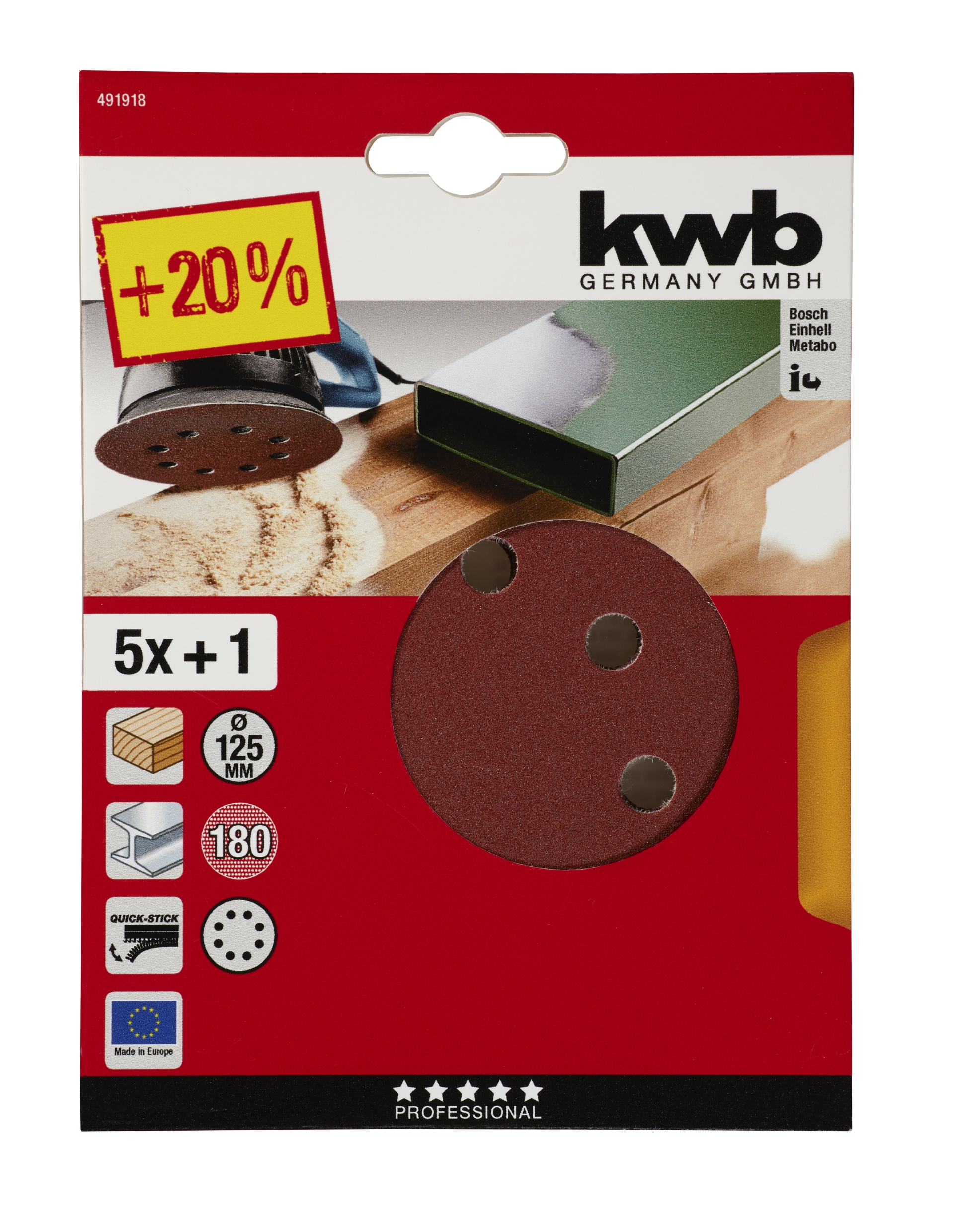 kwb Schuurschijven, hout en metaal, edelkorund, Ø 125 mm, geperforeerd Quick stick -- Schuurschijven, Ø 125 mm, HOUT & METAAL, edelkorund, met aluminiumoxide bestrooid, gebonden met volledig synthetisch hars, versterkt dragermateriaal, met velours rug, geperforeerd, voor excentrische schuurmachines, voor het schuren van metaal, hout, verf, lak, plamuur, steen en kunststof.