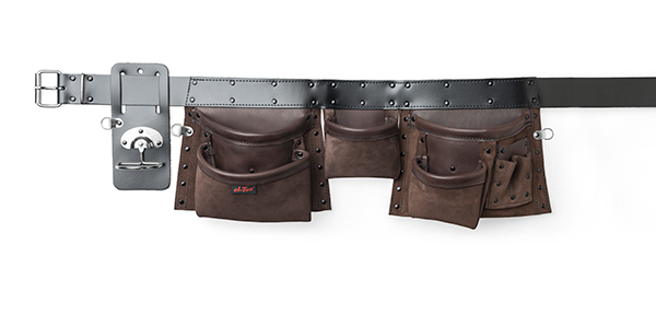 Gemaakt van luxe, stevig leer. Voorzien van 2 grote zakken uitgerust met gereedschapskoord ringen, 3 midden formaat zakken, 1 klein vakje en 2 pentassen. Dit alles is bevestigd op een zware kwaliteit lederen riem van 125 x 5 cm.