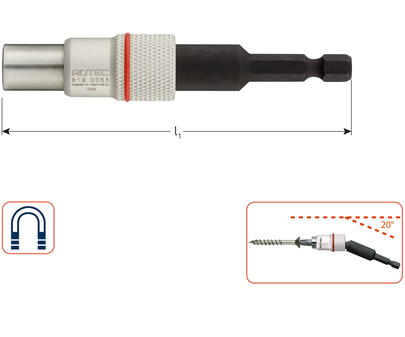 Magn. snelspan bithouder E6,3 x 65 mm voorzien van magneet en met kogelgewricht (max 20°).