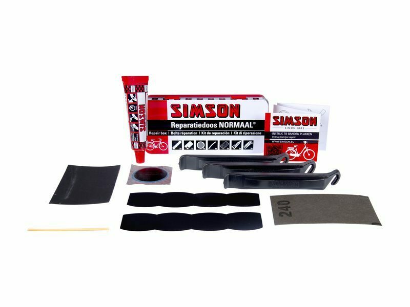 De enige echte originele Simson Reparatiedoos Normaal. Deze reparatiedoos is handig voor het repareren van vrijwel iedere traditionele fietsband zowel thuis als onderweg. Volg bij het plakken van de band de bijgeleverde instructies. De inhoud van de Simson Reparatiedoos Normaal is goed voor 12 plakbeurten en bestaat uit: 2x vierstrip pleister, 1x knippleister, 1x waterproof schuurpapier, 1x buitenbandplakker 35mm, 1x ventielslang, 1x tube solutie 10ml, 3x bandenlichter.