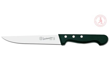 Professioneel slachtmes met zwarte kunststof p.o.m. handgreep. voorzien van aluminium klinknagels. Chroom vanadium staal.