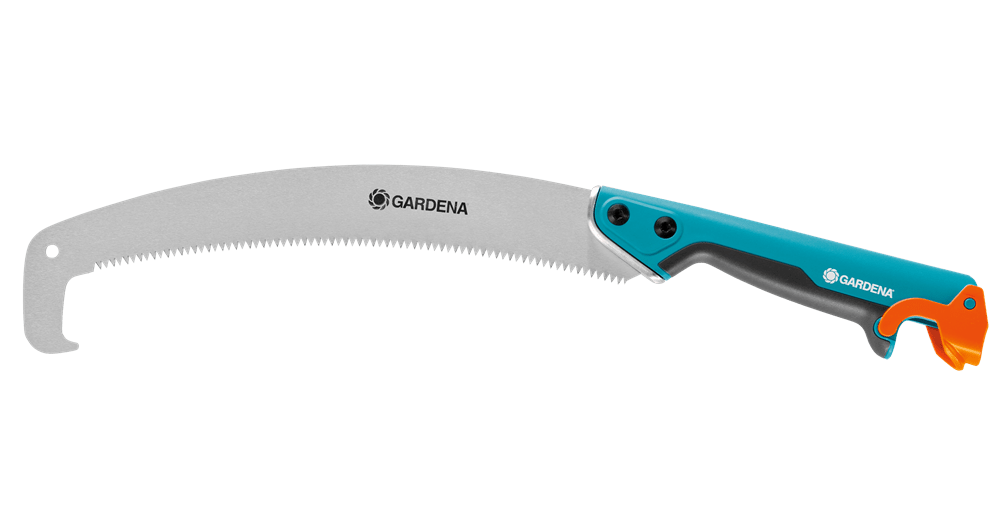 De GARDENA combisystem snoeizaag 300 PP, gebogen, met een zaagblad van 315 mm kan flexibel worden gebruikt afhankelijk van waar u wilt zagen: als u takken onder handbereik wilt zagen, gebruikt u de snoeizaag eenvoudig als “normale” handzaag. De zaag ligt goed in de hand dankzij het ergonomische handvat met softgrip componenten. Als u takken tot een hoogte van 5 meter wilt afzagen, vergroot u het bereik van de snoeizaag door een combisystem telescoop steel te gebruiken. Praktisch: plaats de combisystem steel eenvoudig op de zaag. De veiligheidsvergrendeling garandeert een muurvaste verbinding. Gezette zaagtanden met impulsgeharde tandpunten, aan beide zijden geslepen zorgen voor veilig zagen. Dankzij een speciale coating, is de CS snoeizaag 300 PP, gebogen, optimaal beschermd tegen roest. Een stop op het uiteinde van het handvat beschermt uw hand tegen wegglijden, ook bij trekkende bewegingen. Afgezaagde takken kunnen eenvoudig weggehaald worden met de takhaak aan de bovenzijde van het zaagblad. Met ophangoogje en mesbeschermer om de zaag veilig te kunnen opbergen.