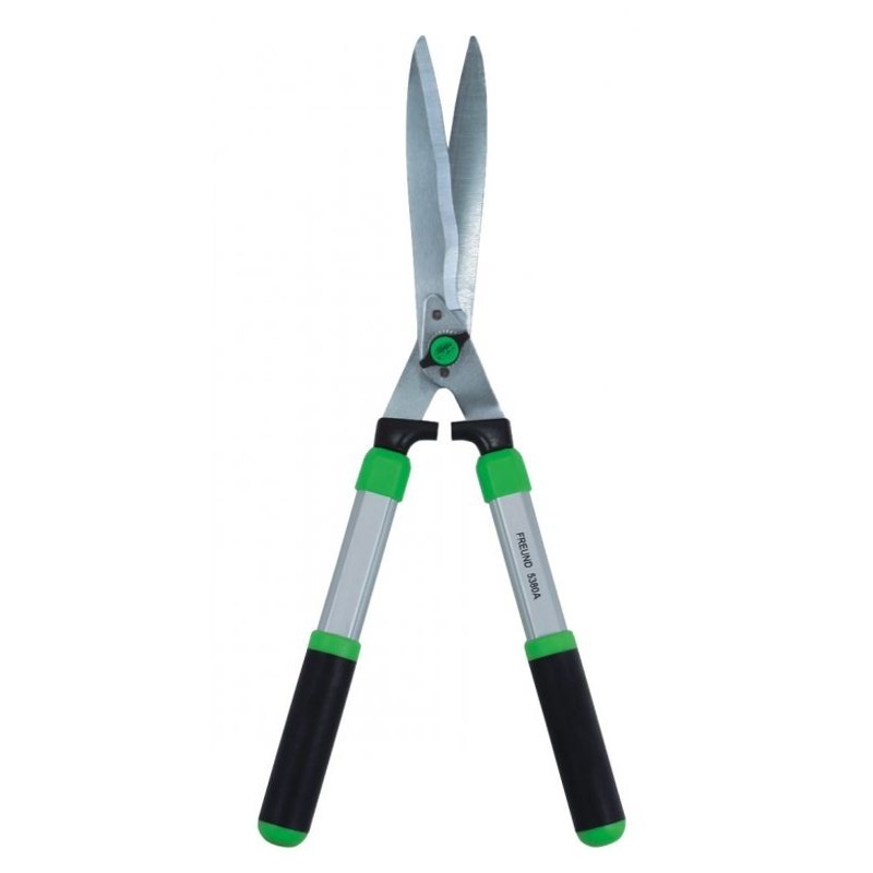 lichte heggenschaar met opgeklonken golfsnede messen, hardverchroomd, met aluminium buizen, tegen kou geïsoleerde handgrepen, instelbare borgmoer en aanslagdemperlengte blad: 16cm totale lengte: 60cm