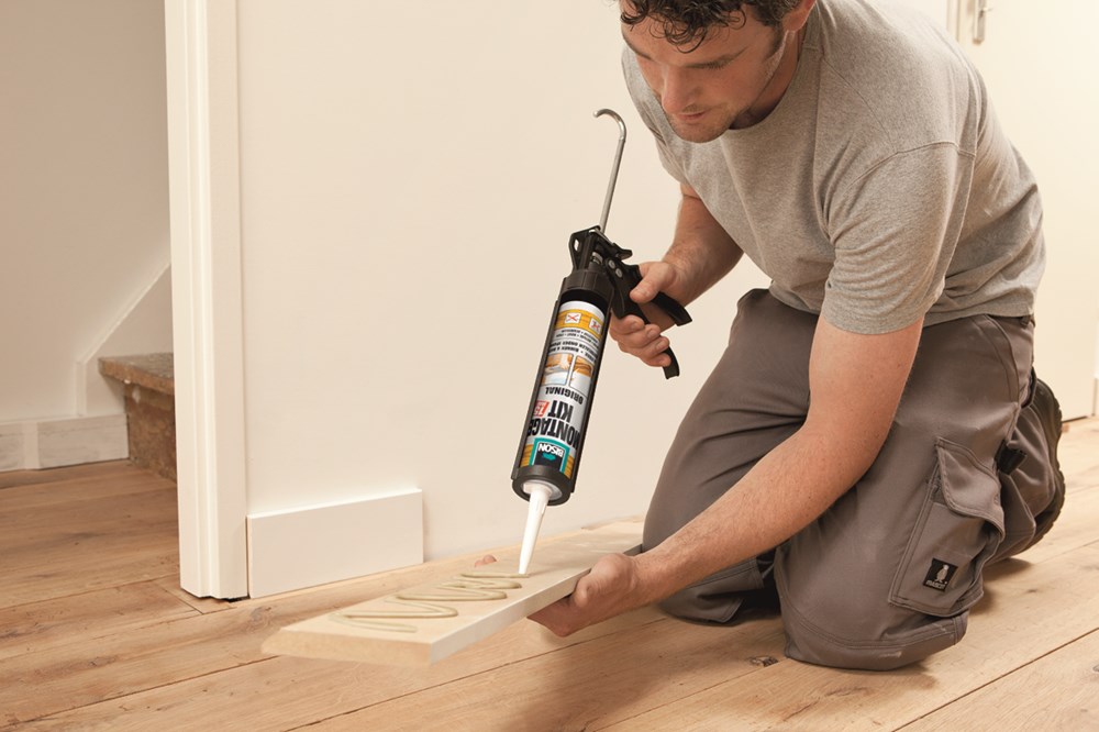 Extra sterke, universele, vullende montagelijm op basis van neopreenrubber. Voor het eenvoudig en muurvast bevestigen van o.a. hout, kunststof, metaal, steen, gips en tegels op allerlei ondergronden zoals beton, steen, pleisterwerk, hout, spaanplaat, metaal en kunststof. Zowel binnen als buiten toepasbaar en geschikt voor het bevestigen van materialen onder spanning. Blijvend elastisch. Spijkers en schroeven overbodig.