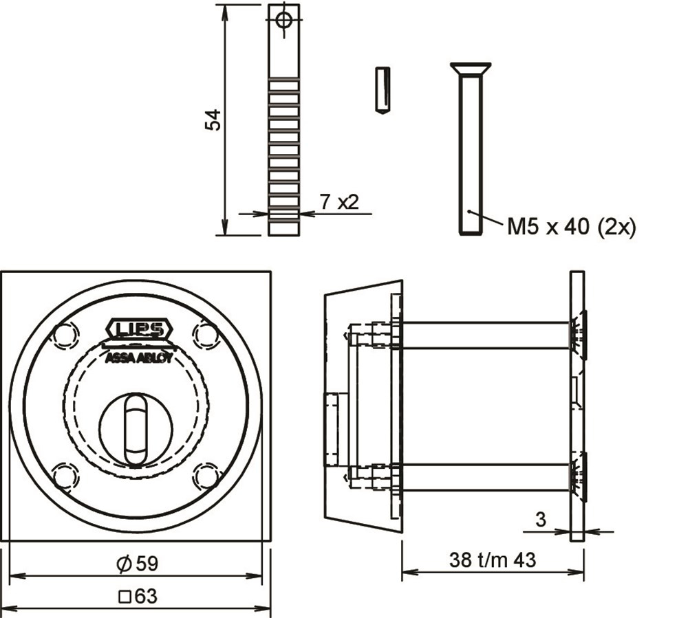 Geschikt voor situaties waarin LIPS en Nemef veiligheidsoplegsloten met losse buitencilinder (1704, 1734, 1742, 1744, 1754) en vaste buitencilinder (1703, 1733, 1743, 1753) gemonteerd zijn. Geschikt voor deurdikte 38-42mm (losse buitencilinder) of deurdikte 38-39mm (vaste buitencilinder). Niet geschikt voor veiligheidsoplegsloten met Octro en LIPS-Keso cilinders.