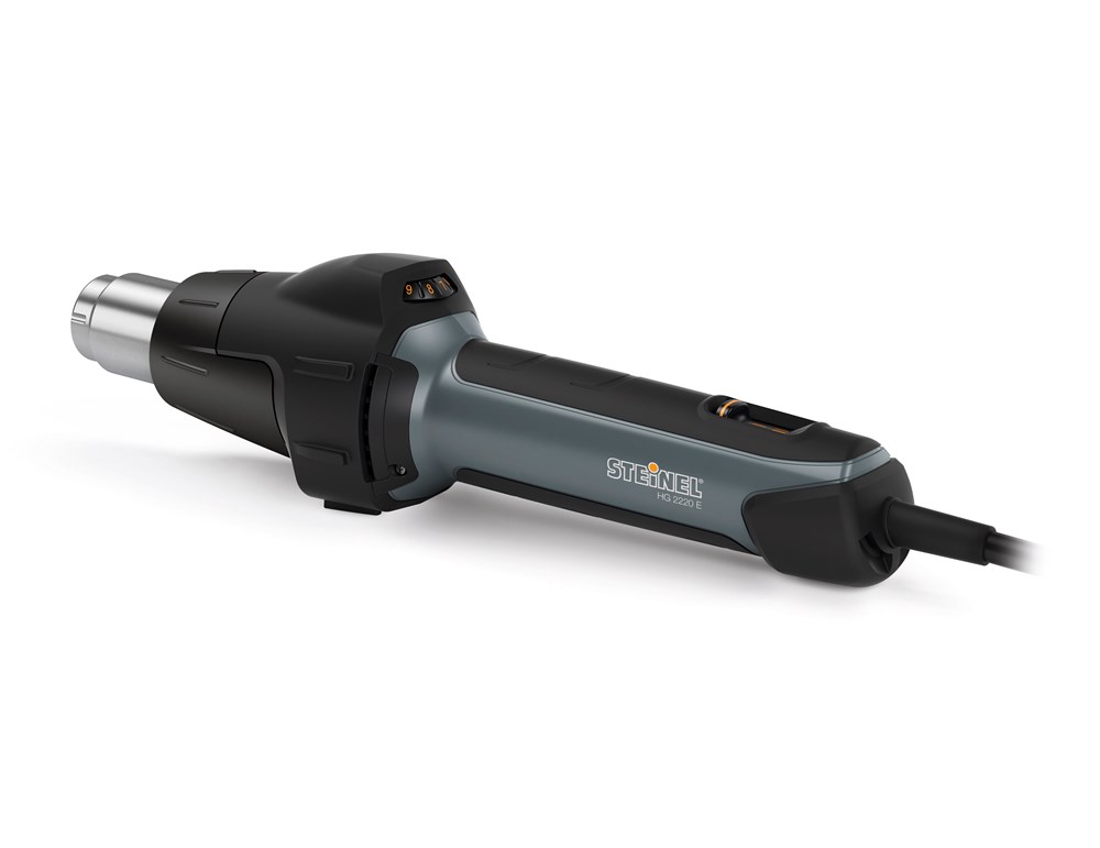 Compact. Licht. Onvermoeibaar. Elektronisch gerege ld heteluchtpistool HG 2220 E. 2200 W, traploze temperatuurinstelling van 80 °C tot 630 °C in 9 stappen m.b.v. stelwieltje. Regeling luchthoeveelheid in 2 standen van 150 l/min. tot 500 l/min.