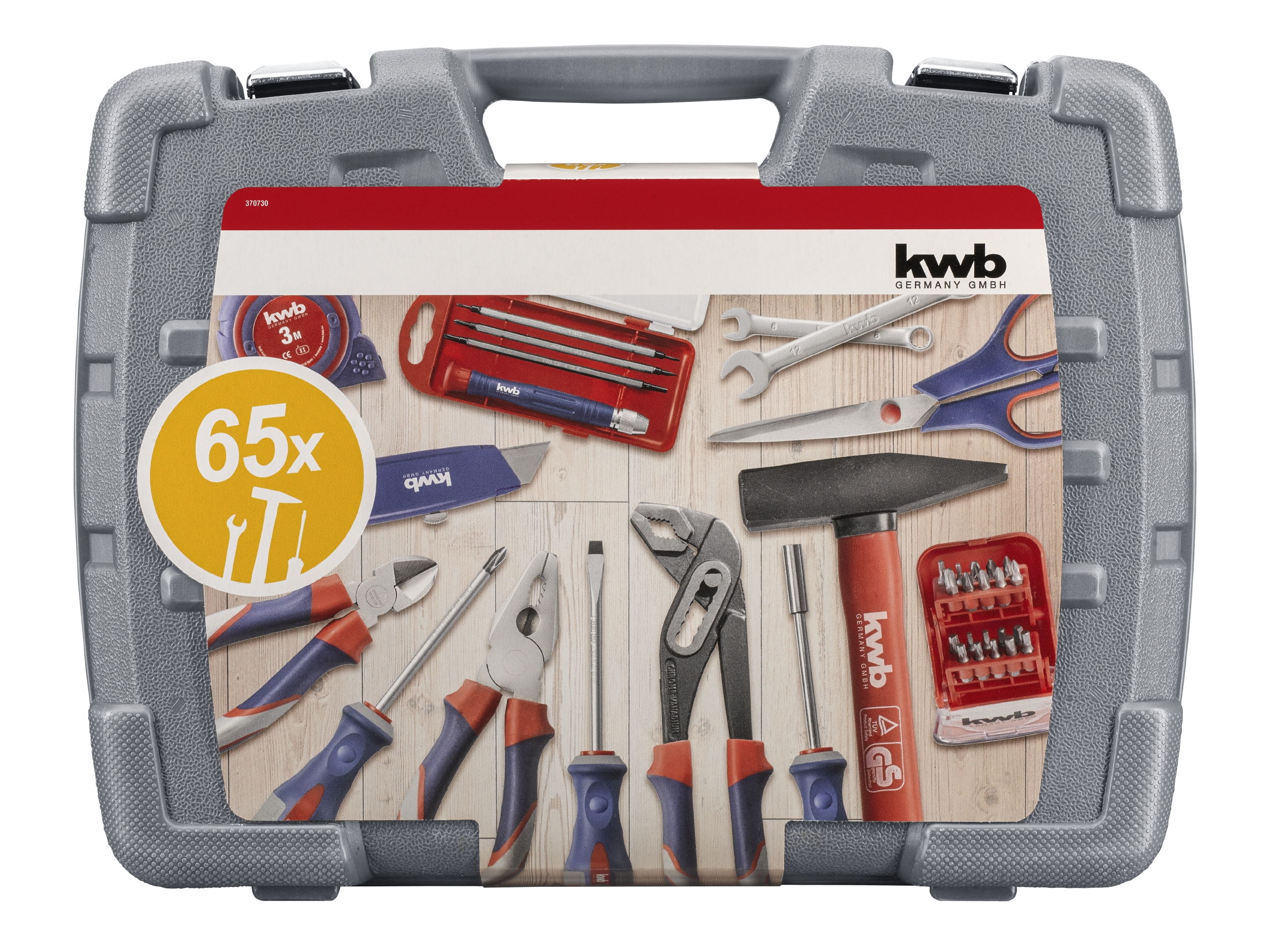 kwb Gereedschapskoffer, 65-delig -- De 65-delige gereedschapskoffer bevat een breed spectrum van gereedschappen. Ideaal als basisuitrusting voor de werkplaats in een handige kunststof koffer voor mobiel gebruik.