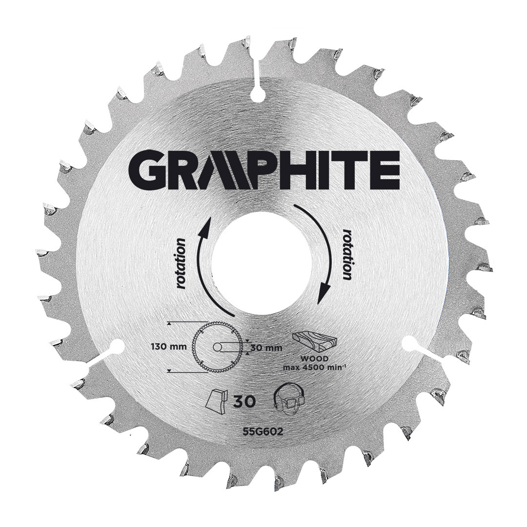 Solid carbide saw blade GRAPHITE (ref. no. 55H602) with diameters 130 mm, made of MN65 manganese steel alloy with high resistance to temperature and deformations. Teeth with sintered carbide tips YG6A are designed for rough cutting of wood and wood like materials, like plywood, chipboard, MDF. Thanks to included adapter rings it is possible to use the blade in most of saw models.
