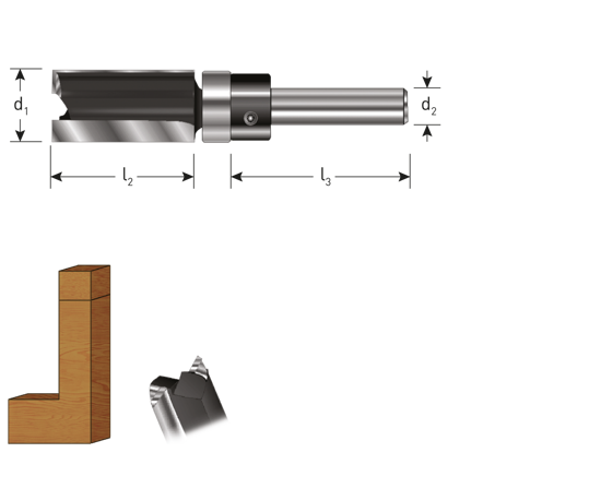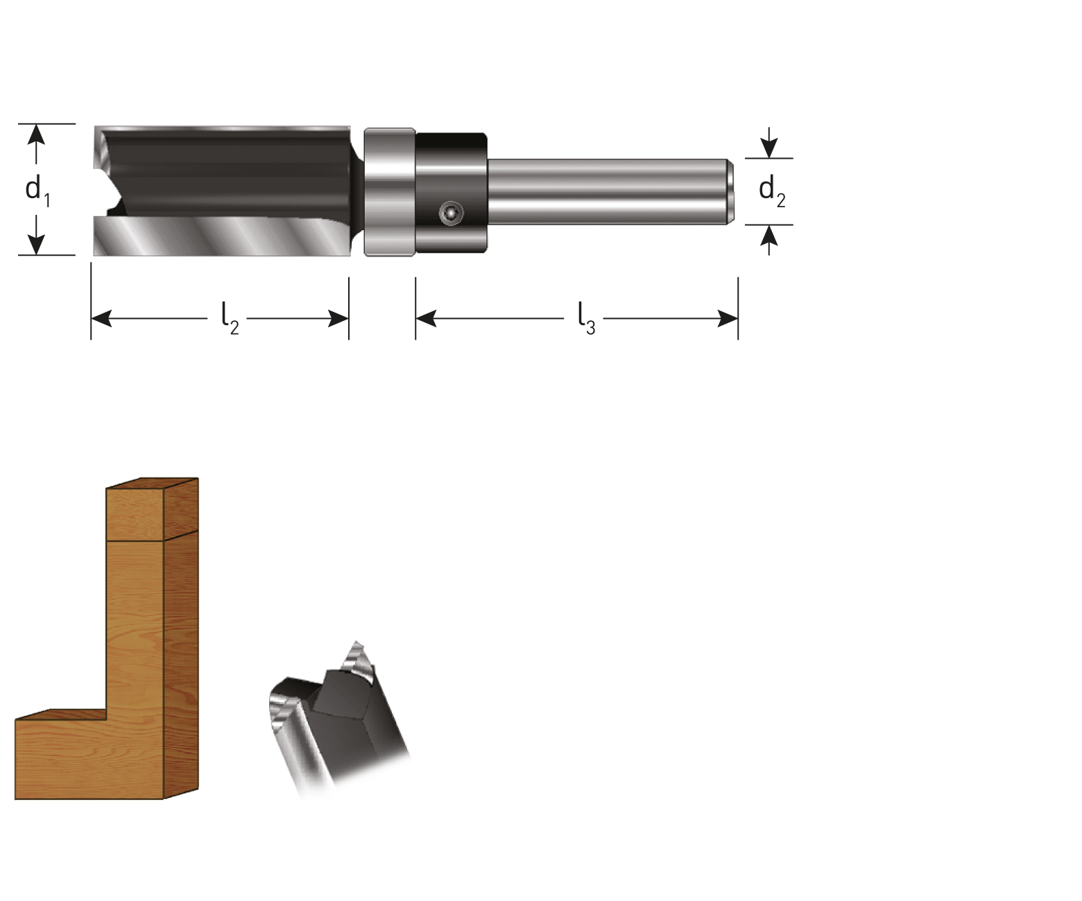 Tweesnijder. Grond- en zijsnijdend. Nette en splintervrije afwerking. Ook te gebruiken als kantenfrees. Geschikt voor het gebruik van gebogen werkstukken en bij het toepassen van sjablonen. Geleidelager is vervangbaar.