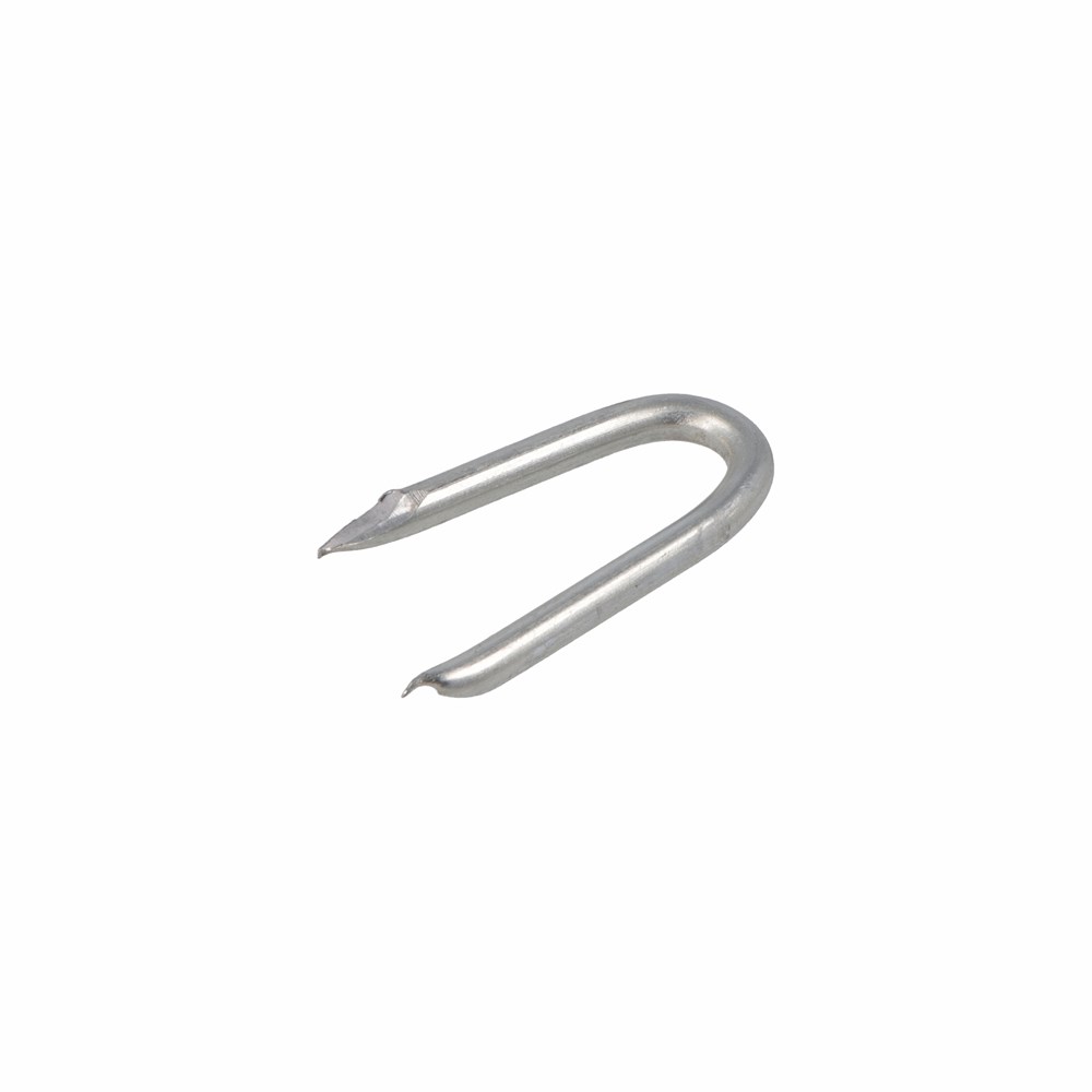 Een draadkram wordt gebruikt voor het bevestigen van draad en gaas als afrastering op houten palen.